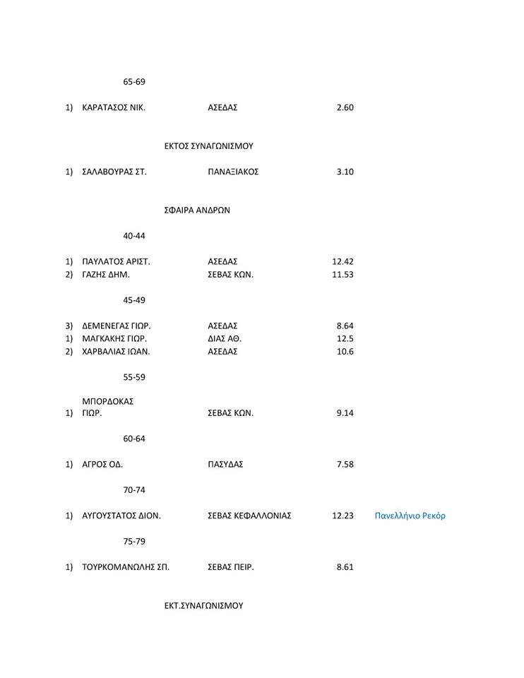 Σφαιροβολία (4 κ.) Ανδρών 70-74: Διονύσης Αυγουστάτος με 12.23μ., προηγούμενο του Μανώλη Λουδάρου με 10.53μ.