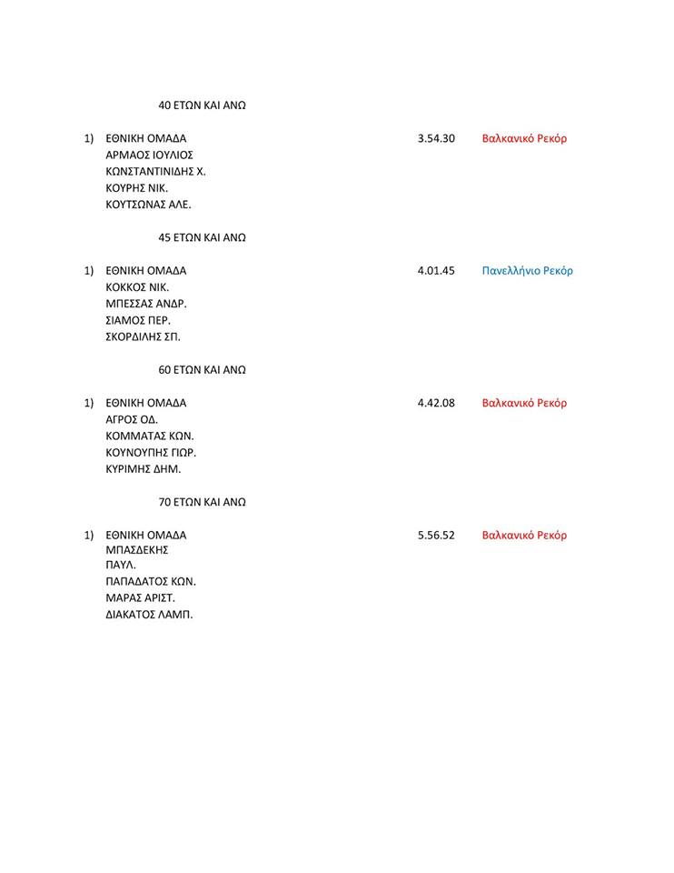 4x400μ. 70+ ετών: Εθνική Ομάδα (Λάμπρος Διακάτος, Αριστείδης Μάρας, Κώστας Παπαδάτος, Παύλος Μπασδέκης) με 5.56.52, προηγούμενο της Σερβίας με 7.36.72 από το 2007.