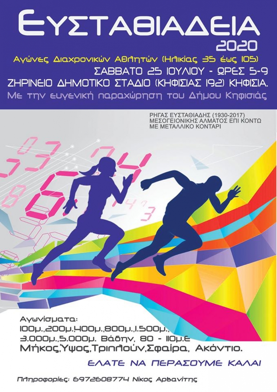 Τα Ευσταθιάδεια 2020 θα διεξαχθούν τελικά το Σάββατο, 25 Ιουλίου στο Ζηρίνειο στάδιο Κηφισιάς, καθώς δεν υπήρχε διαθεσιμότητα των κριτών Αττικής την 1η Αυγούστου, λόγω της διεξαγωγής του Πανελληνίου Πρωταθλήματος ΑΜΕΑ στο ΟΑΚΑ.