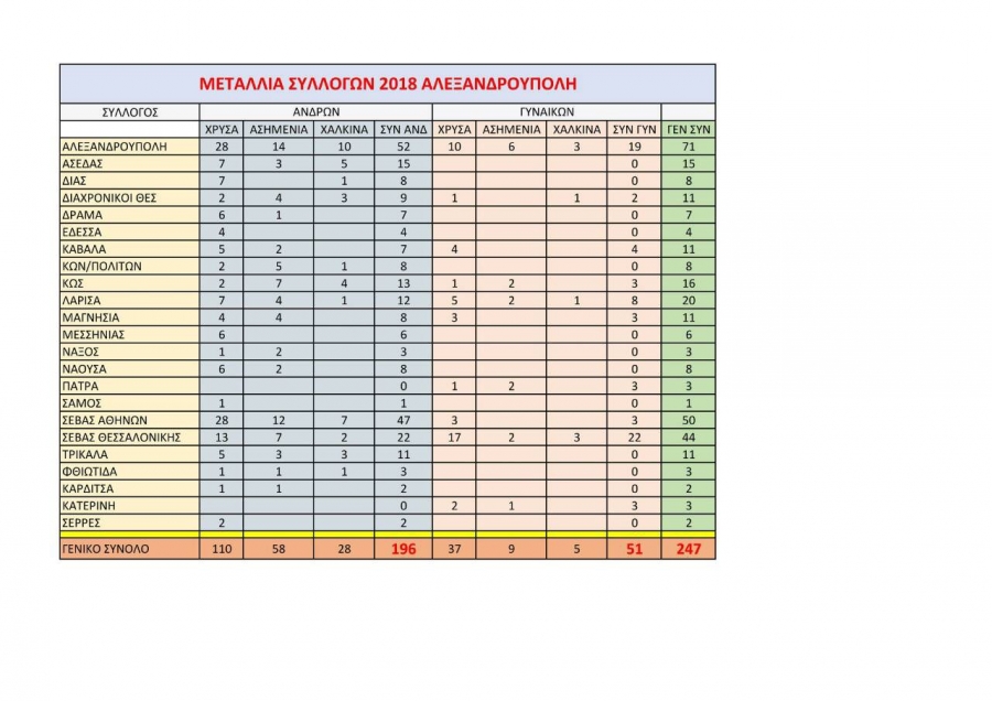Παραπάνω φαίνεται ο πίνακας μεταλλίων ανά σύλλογο για το Πανελλήνιο Πρωτάθλημα Διαχρονικών Αθλητών.