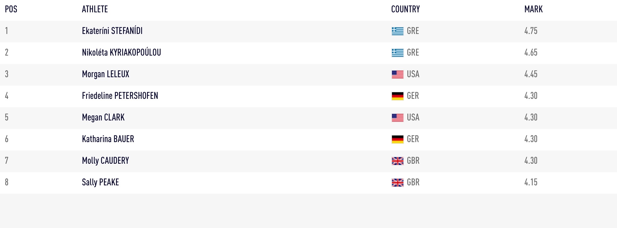 Η Κατερίνα Στεφανίδη συνεχίζει τα σερί των νικών της κερδίζοντας τη 1η θέση και σε αυτό τον αγώνα, ξεπερνώντας μέχρι και τα 4.75μ. Η Κατερίνα ξεκίνησε τον αγώνα της απευθείας με το ύψος 4.65, το οποίο ξεπέρασε με τη δεύτερη προσπάθεια, ενώ συνέχισε με το νικητήριο ύψος 4.75, που το ξεπέρασε με τη 3η προσπάθεια τελικά. Η ίδια ήθελε να ξεπεράσει και το ύψος των 4.84μ, ωστόσο έκανε τρεις άκυρες προσπάθειες και δε τα κατάφερε. Δείχνει όμως πως είναι σε πολύ καλή κατάσταση και έτοιμη να διεκδικήσει ακόμη ένα χρυσό μετάλλιο στο Παγκόσμιο του Birmingham, σε λίγες ημέρες.