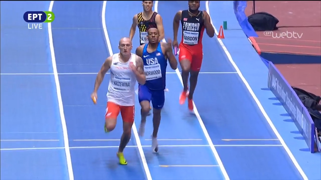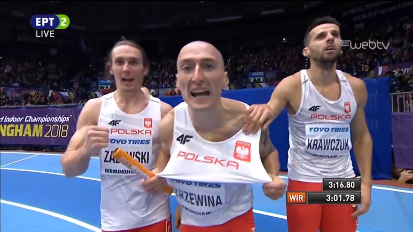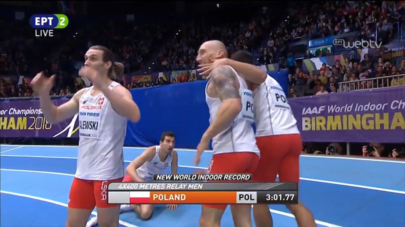 Η τελευταία μέρα του Παγκοσμίου Πρωταθλήματος Στίβου στο Birmingham είναι σίγουρα η μέρα των Πολωνών.Με εκπληκτική κούρσα στα 4χ400μ κέρδισαν στα τελευταία μέτρα τους Αμερικανούς και σημείωσαν Παγκόσμιο ρεκόρ με 3.01.77.Ο τελευταίος αθλητής της Πολωνίας Krzewina ¨ετρεξε 44.8 το 400αρι και κάλυψε την μεγάλη απόσταση που είχαν πάρει οι Αμερικανοί στις προηγούμενες αλλαγές ¨οπου τερμάτισαν 2οι με 3.01.97 και 3οι οι πολύ καλοί Βέλγοι με τα αδέλφια Borlee να κάνουν εθνικό ρεκόρ με 3.02.51.Οι Πολωνοί είχαν επίσης 2η θέση στα 4χ400μ Γυναικών και χάλκινο μετάλλιο στα 1500μ με τον Marcin LEWANDOWSKI .