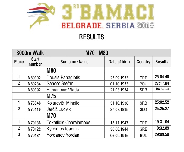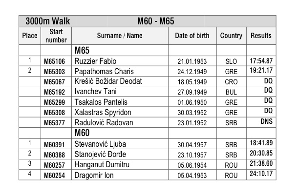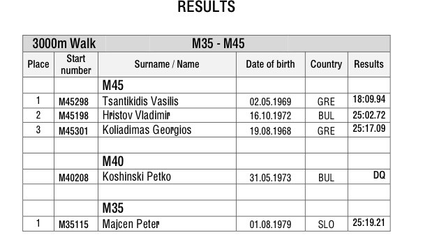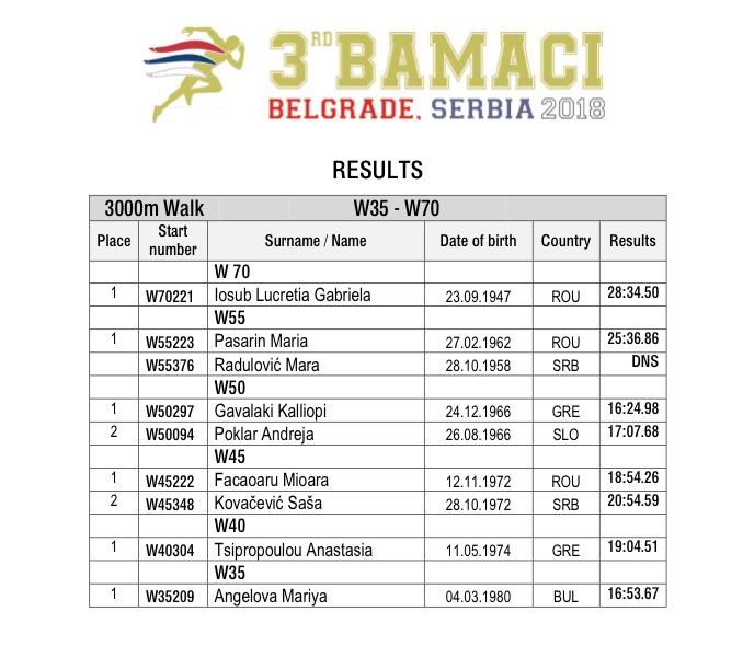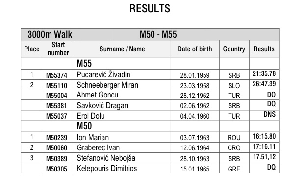 η Καλλιόπη Γαβαλάκη στα 3.000μ. βάδην στην κατηγορία 50-54 με 16.24.98, συντρίβοντας ουσιαστικά το προηγούμενο ρεκόρ της Ρουμάνας Maria Pasarin που ήταν 19.05.77 από το 2015, και