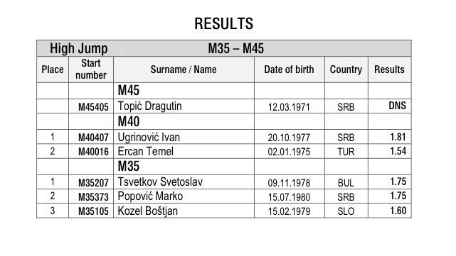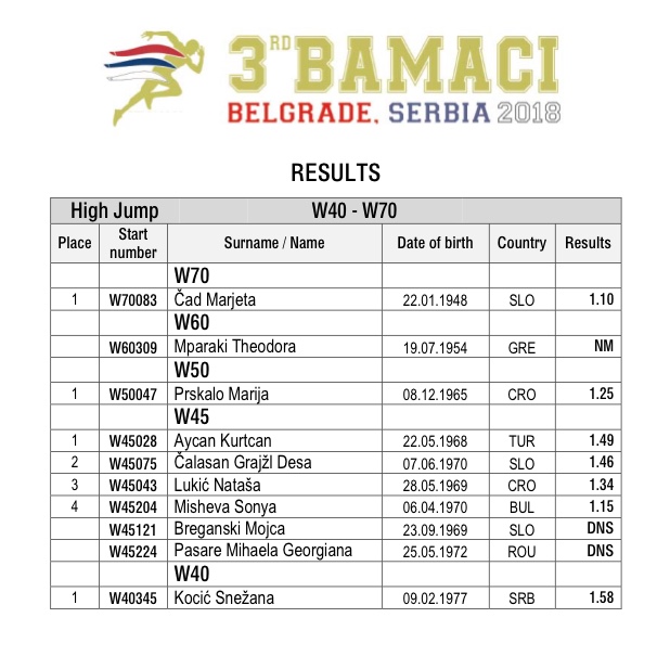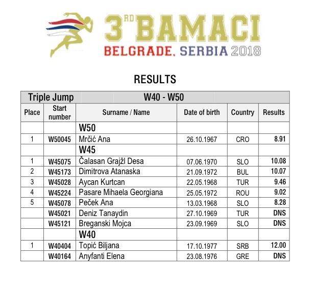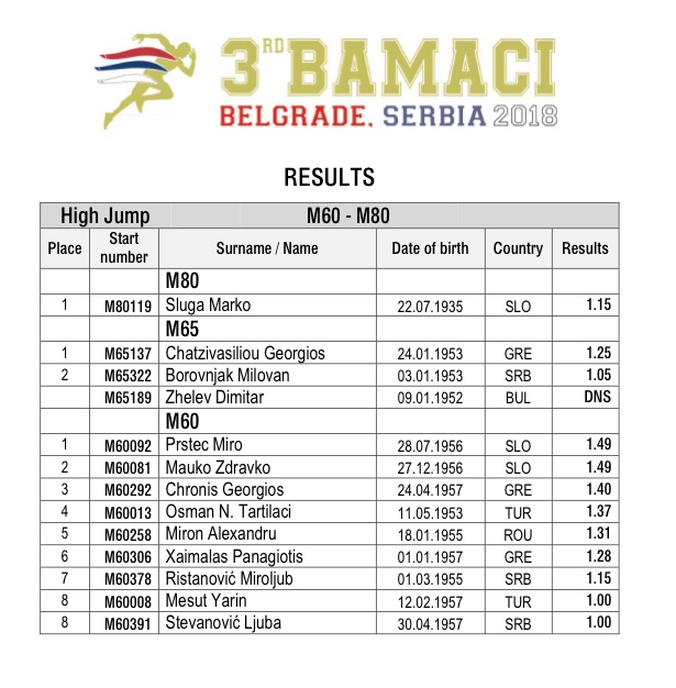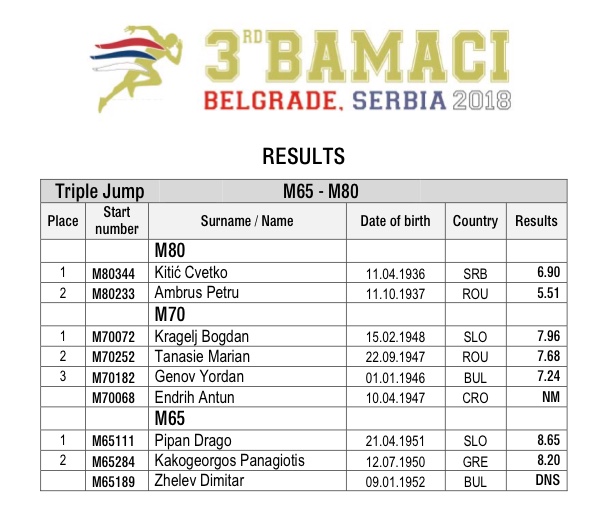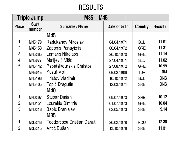 Τη πρώτη ημέρα, 10/3, του Βαλκανικού Πρωταθλήματος Masters στο Βελιγράδι, πραγματοποιήθηκαν και τα αγωνίσματα του τριπλούν και ύψους ανδρών και γυναικών.