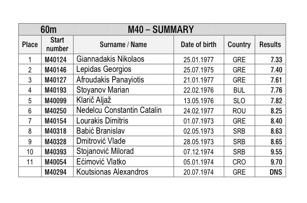 Η Άννα Δάφτσου στις γυναίκες στην κατηγορία 45-49 με τρία νέα ρεκόρ σε 60μ., 200μ. και 400μ. με 8.61, 28.52 και 66.34 αντίστοιχα και ο Νίκος Γιανναδάκης στους άνδρες στην κατηγορία 40-44 με δύο νέα ρεκόρ σε 60μ. και 200μ. με 7.33 και 23.74 ήταν οι κορυφαίοι!