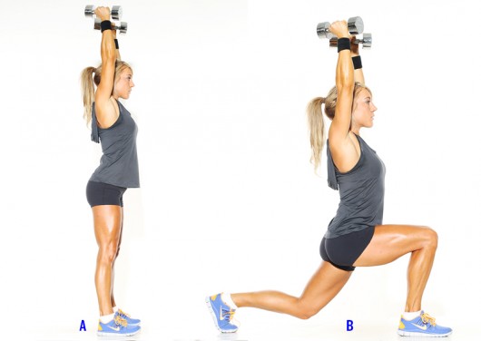Κρατήστε ένα ζευγάρι αλτήρων πάνω από τους ώμους σας, με τα χέρια σας τεντωμένα και τους αγκώνες όχι λυγισμένους. Πατήστε μπροστά με το αριστερό σας πόδι, και χαμηλώστε το σώμα σας προς τα κάτω μέχρι το γόνατό σας να σχηματίζει γωνία 90 μοιρών. Επιστρέψτε στην αρχική σας θέση και επαναλάβετε με το δεξί σας πόδι. Τότε, έχετε εκτελέσει μια επανάληψη.