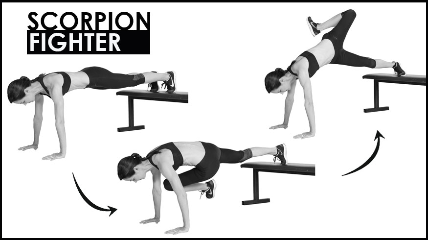 Πάρτε τη θέση που έχετε όταν κάνετε push-ups, όμως με τα πόδια σας πάνω σε κάποιο πάγκο ή σκαλοπάτι, ώστε να βρίσκεστε σε ύψος από το πάτωμα. Φέρτε το δεξί σας γόνατο μέχρι τον αριστερό σας ώμο, καθώς στρέψετε τους γοφούς σας προς τα πάνω, με κατεύθυνση προς τα αριστερά, όσο περισσότερο μπορείτε. Έπειτα, κάντε το αντίστοιχο με το αριστερό σας γόνατο, στρέφοντας τώρα τους γοφούς σας προς τα πάνω και προς τα δεξιά• προσπαθώντας να πλησιάσετε όσο περισσότερο μπορείτε το δεξί σας γόνατο στο πίσω μετος του αριστερού σας ώμου. Έτσι, έχετε εκτελέσει μια επανάληψη της άσκησης. Συνεχίστε για 30’’ με το δεξί σας πόδι, έπειτα αλλάξτε πόδι.