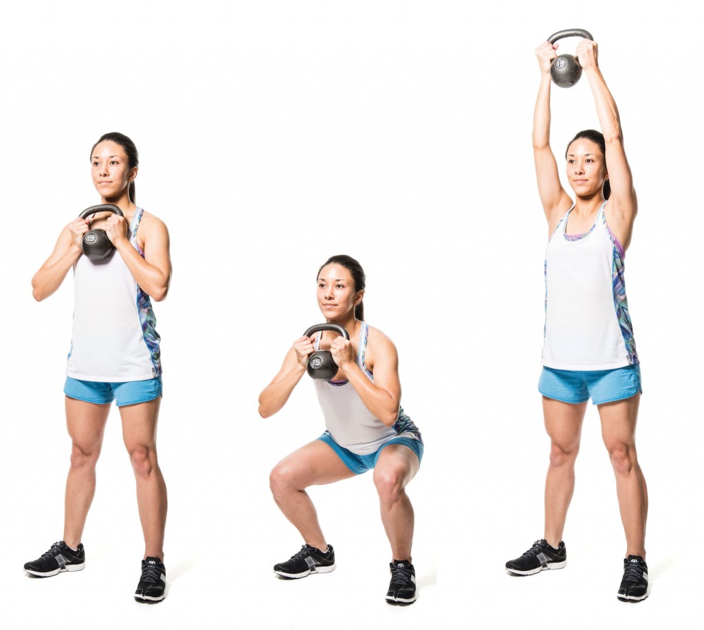 Κρατήστε το βαράκι kettlebell με τα δύο σας χέρια μπροστά από το στήθος σας. Σταθείτε με τα πόδια σας ανοικτά τόσο όσο και η απόσταση μεταξύ των ώμων σας. Πιέστε τους μοιρούς σας και κατεβείτε σε θέση βύθισης (squat), μέχρι οι γοφοί σας να είναι παράλληλη με το έδαφος. Σηκώστε το βαράκι kettlebell πάνω από το κεφάλι σας, και καθώς στέκεστε, επαναφέρετε το βαράκι στην αρχική θέση.